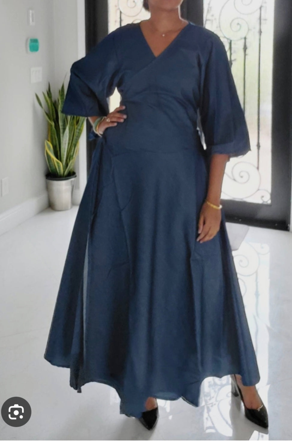 Adjustable Dark Denim Wrap Maxi Dress with Bell Sleeves (Best Fits 1X-3X) Ptp 24-27in