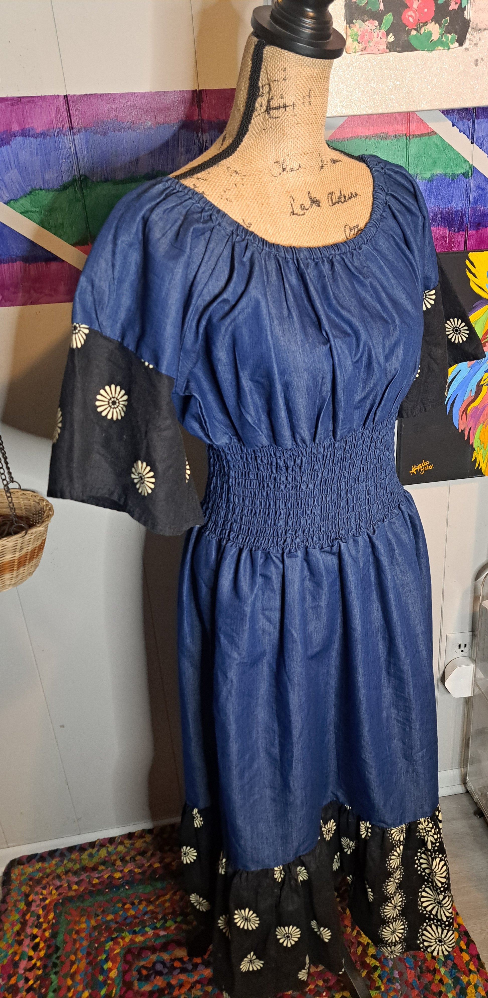 Denim/Black & Creme Bell Sleeve Dress with Elastic Waist (One Size) Best Fits Small-Large
