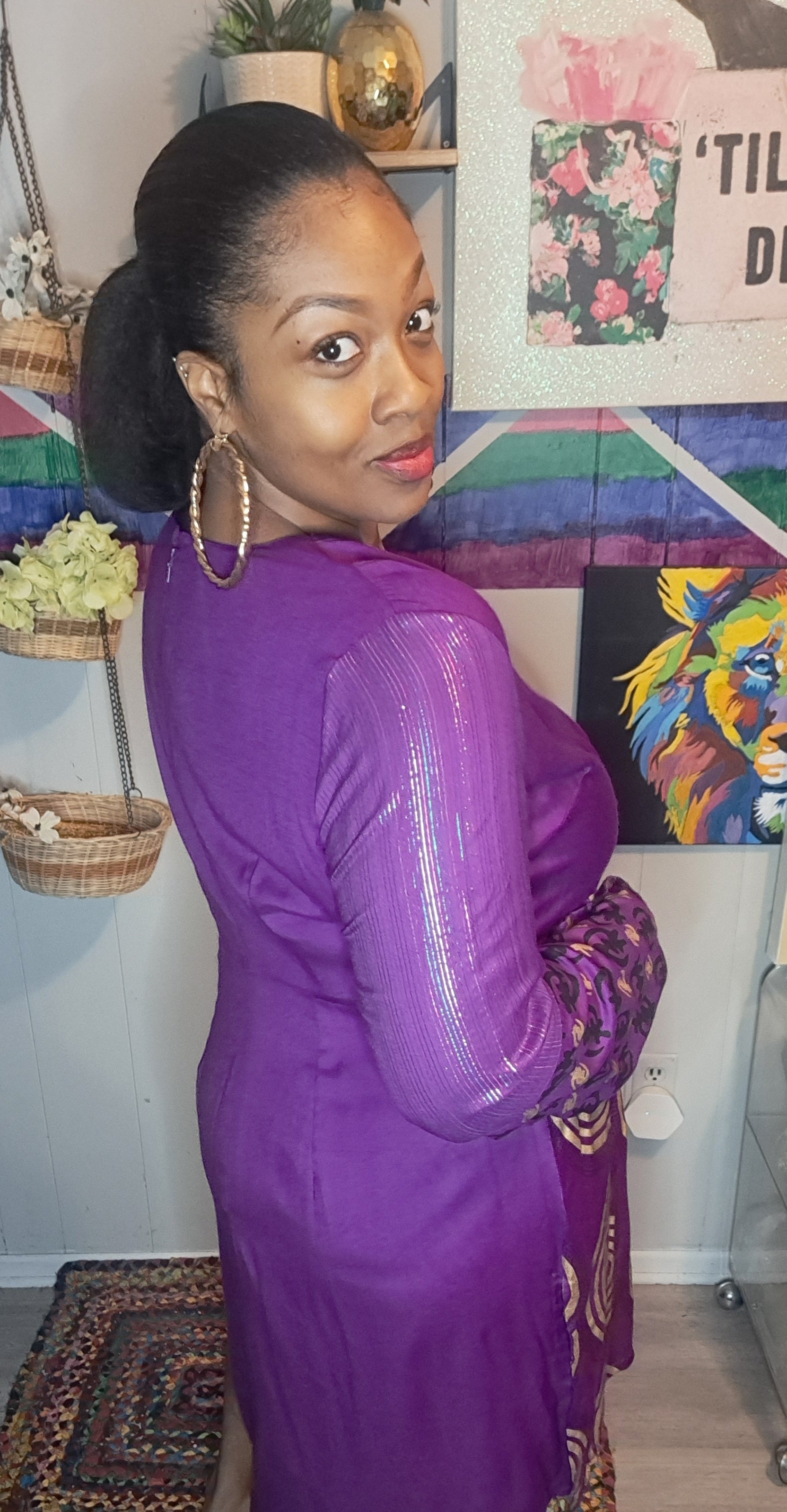 ASHRO Purple/Blk/Gold Metallic Patchwork Print Bells Sleeve Tunic Top with Back zipper SZ XL (Ptp 24.5in Waist 21in)