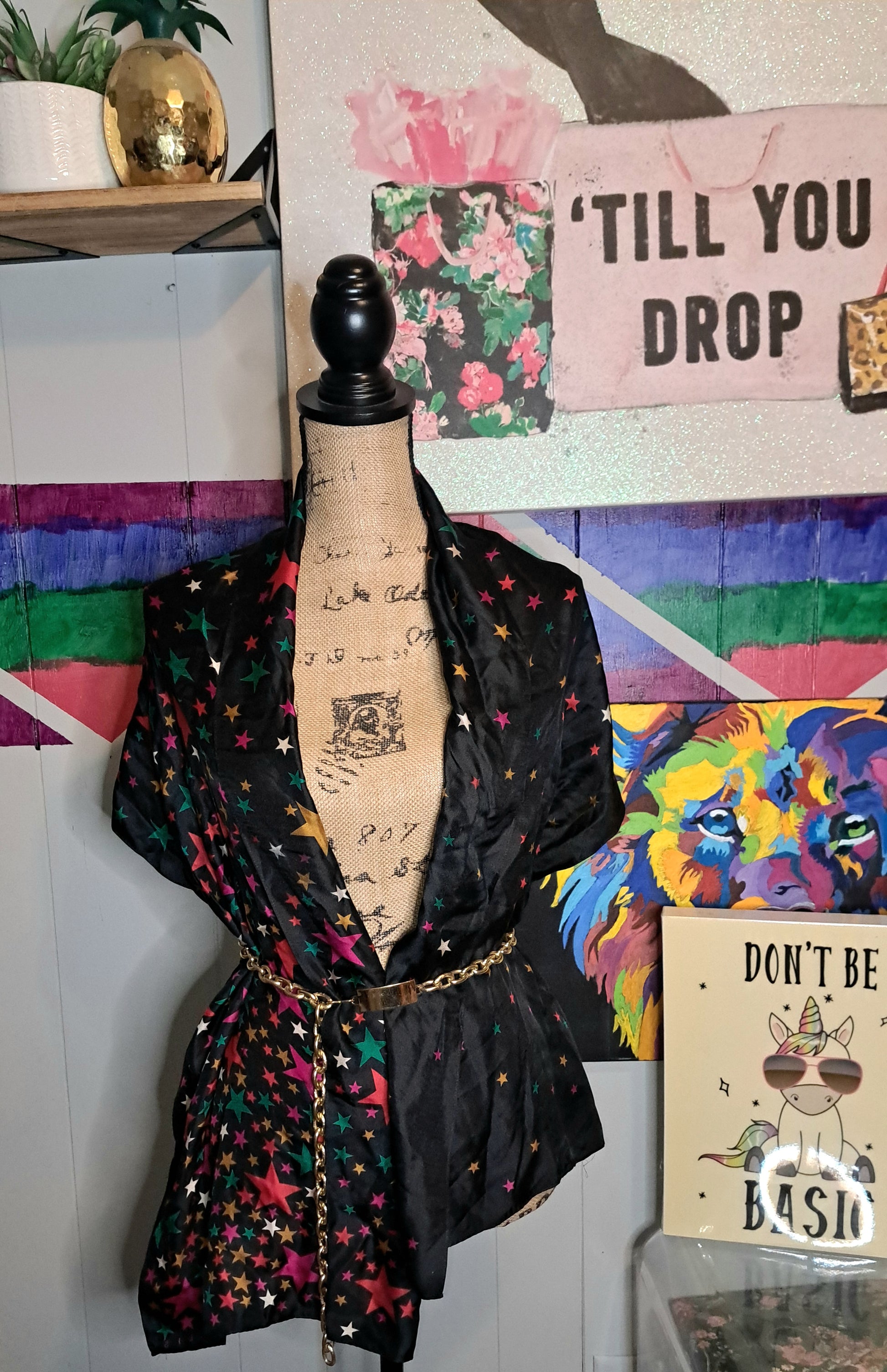 Vtg Perry Ellis Silk Blk/Multicolored Star Print Scarf 17x64in